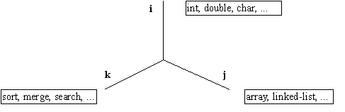 With this scenario given, i*j*k different versions of code have to be designed - a sort algorithm for an array of int, the same sort algorithm for an array of double, a search algorithm for a linked-list of double and so on. By using template functions that are parametrized by a data type, the i-axes can be dropped and only j*k versions of code have to be designed, because there has to be only one linked-list implementation which then can hold objects of any data-type. The next step is to make the algorithms work on different containers - that means that a search algorithm should work on arrays as well as on linked-lists, etc. Then, only j+k versions of code have to be created.